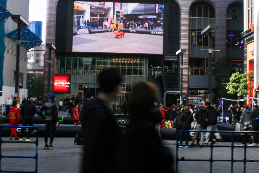 試合の様子は会場内の大型ビジョンでもライブ投影され、広場を訪れた多くの通行人や観光客が足を止め、子どもたちの熱戦に見入る姿が印象的でした。