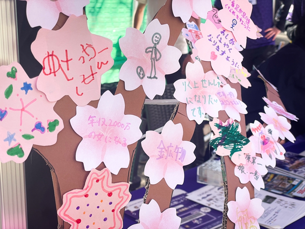 また、NPO法人CORUNUMと連携し、受付周辺には「桜の木にメッセージを書こう」と題したメッセージツリーを設置。こどもたちが自分の夢や思い思いのメッセージをカードに書いて貼り付け、会場に満開の桜の木を作り上げました。