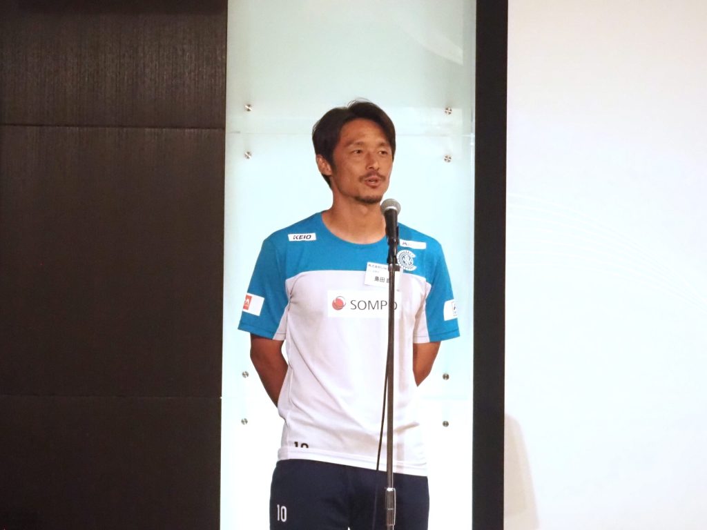 続いて、監督の北嶋秀朗が登壇。10試合連続無得点という、これまでにない苦しい状況であることを受け止めつつ、「サッカーの神様に『このぐらいのことで諦めるのか』と問われているようだ」とコメント。再開後に向けて、「皆さんと一緒に戦いたい」と力強く呼びかけました。