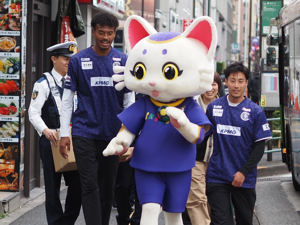 クリアソン新宿の赤井シャロッド裕貴と大山武蔵が4月9日、警視庁四谷警察署が行う「春の全国交通安全運動」の啓発活動に参加し、同署員の皆さんやマスコットとともに、四谷三丁目交差点に立ち、交通安全の呼びかけを行いました。