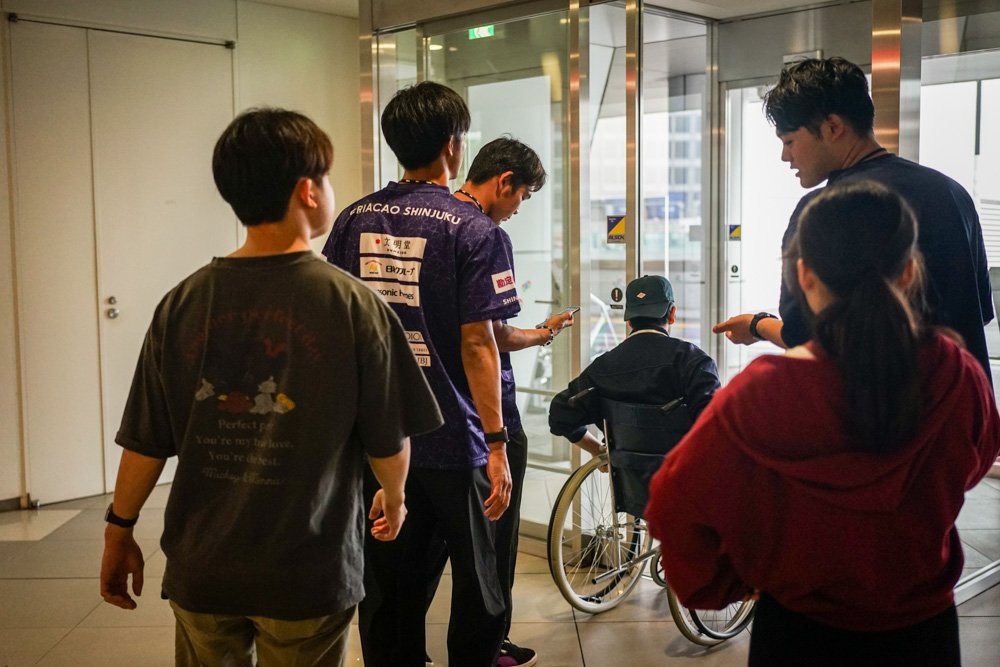 「車いす街歩きプログラム」は、実際に車いすに乗って、まちのバリアやバリアフリーを学ぶ体験型のワークショップです。クリアソン新宿からは、相澤、猪野毛、今井、岩舘、鶴田が参加。首都医校の高度作業療法学科の学生とガイダンスを受けたあと、首都医校がある総合校舎コクーンタワーを出発。三つのグループに分かれて新宿を巡りました。