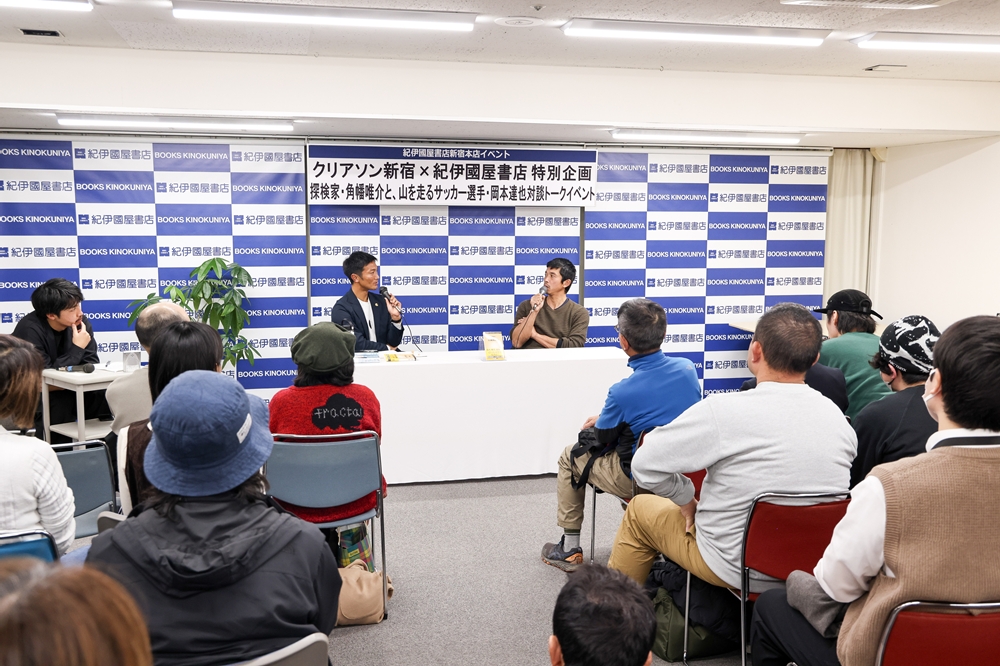 クリアソン新宿は12月22日、法人パートナーである紀伊國屋書店と共同で、探検家の角幡唯介氏と、クリアソン新宿の選手である岡本達也による対談イベントを開催しました。チケットは完売となり、紀伊國屋書店新宿本店のイベントスペースには、角幡氏のファンに加え、日頃からクリアソン新宿を応援してくださっている方々の姿も多く見られました。