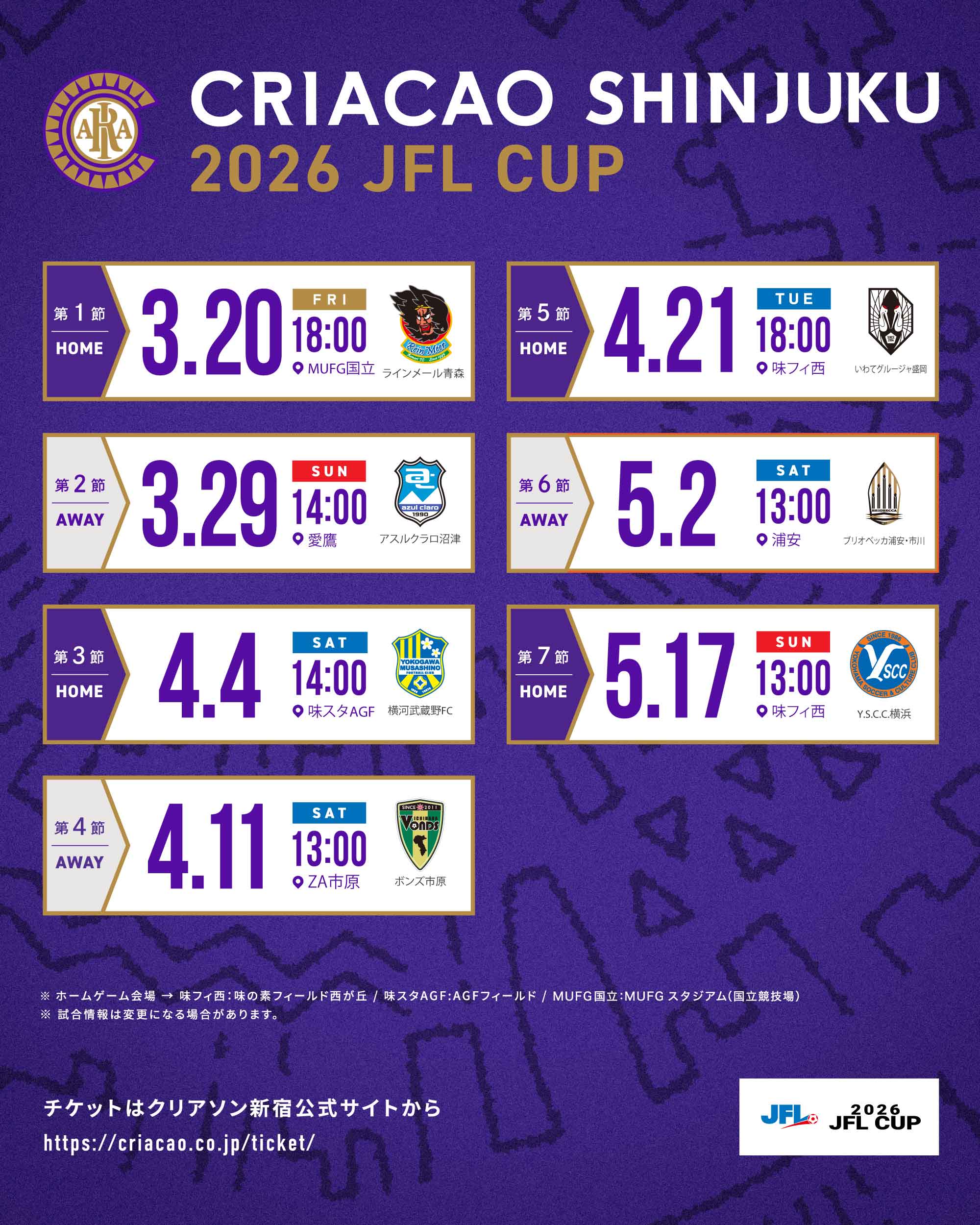 Criacao Shinjuku は、2026 JFL CUPの第3節以降のチケット販売を開始しましたので、お知らせいたします。