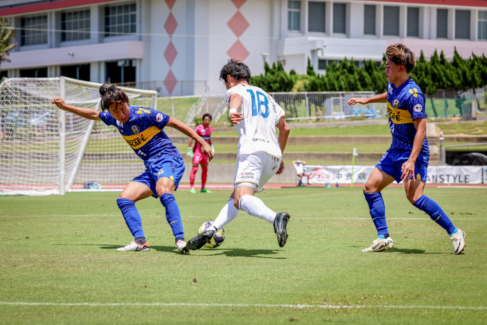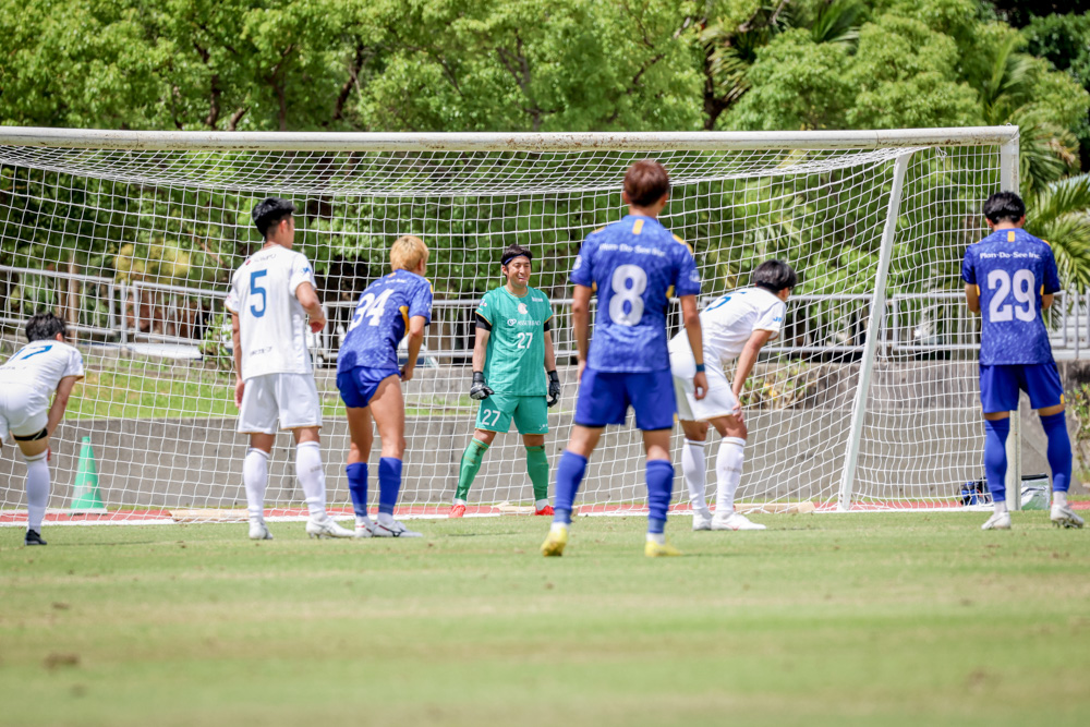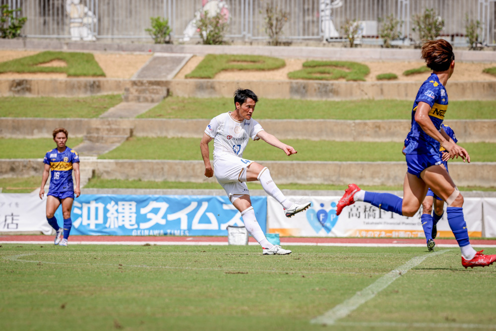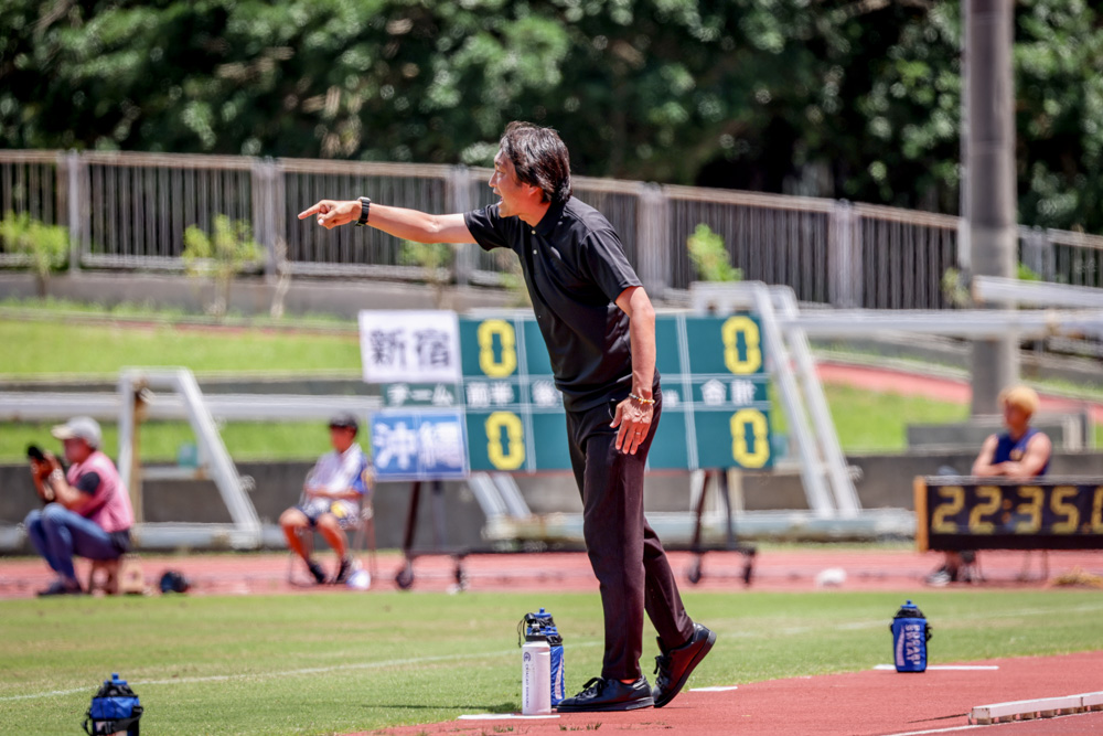 相澤を入れて3バックにしました。彼は走力がある選手なので、3バックの選手が上がってくるような仕組みでサイドを破り、点を取りたかった。それ以外にも色々と試行錯誤しましたが、沖縄SVの方が得点を取るところのクオリティが高かったと思います。