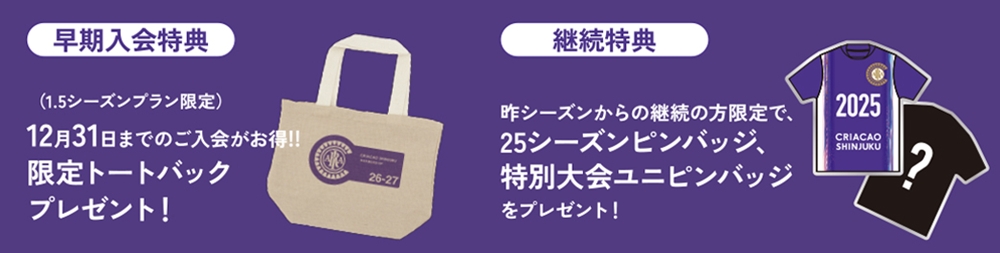早期入会特典として、1.5シーズンプラン限定で12/31までのご入会の方には限定トートバックをプレゼント!お早めのご入会をお待ちしております。