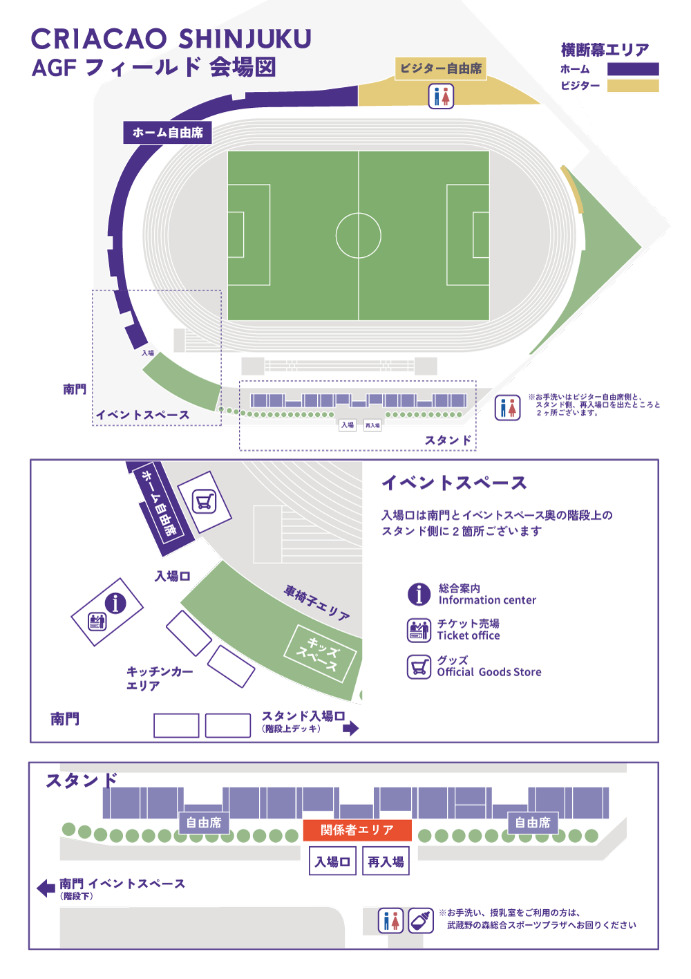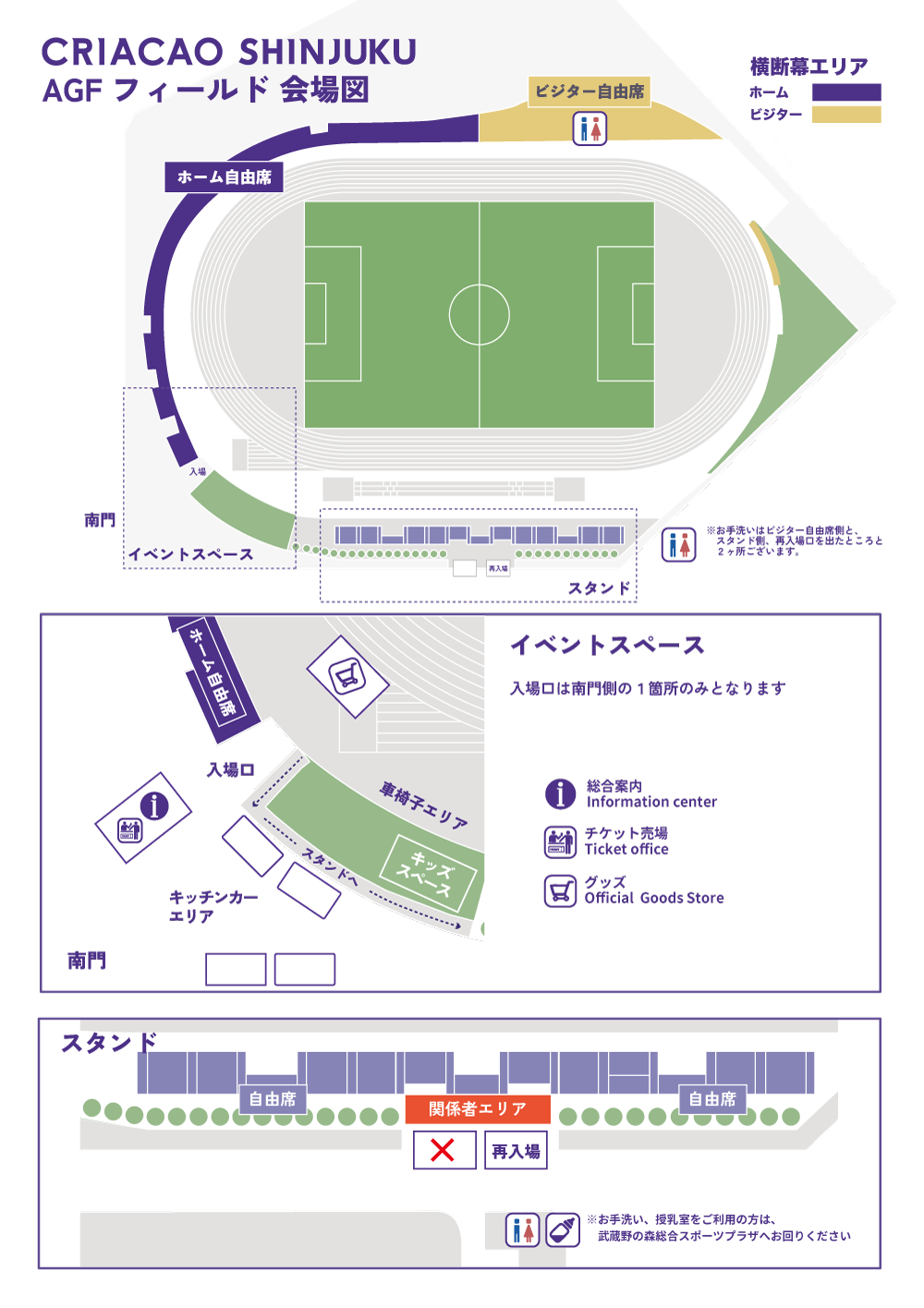 すべてのエリアについてホーム・ビジターいずれのチームのユニフォームやグッズを着用していても、制限なく通行や観戦が可能です。