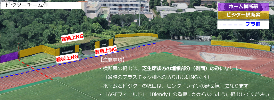 (iii) 横断幕の掲出可能エリアは、芝生席後方の垣根部分(側面)のみになります。