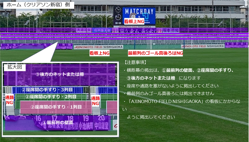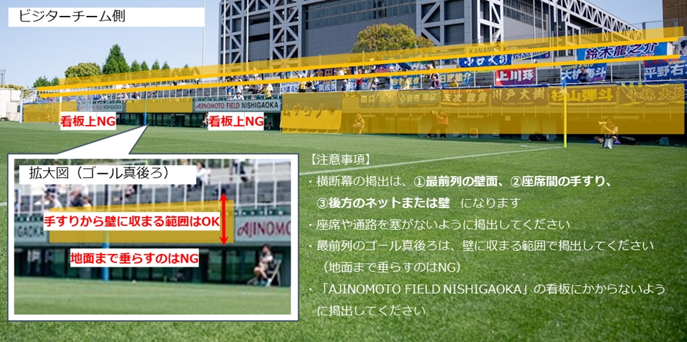(ⅲ) 横断幕の掲出可能エリアは、会場マップ、ホーム自由席、ビジター自由席とビジターコール裏の一部となります。ただし競技場既出の看板広告部分については掲出できません。